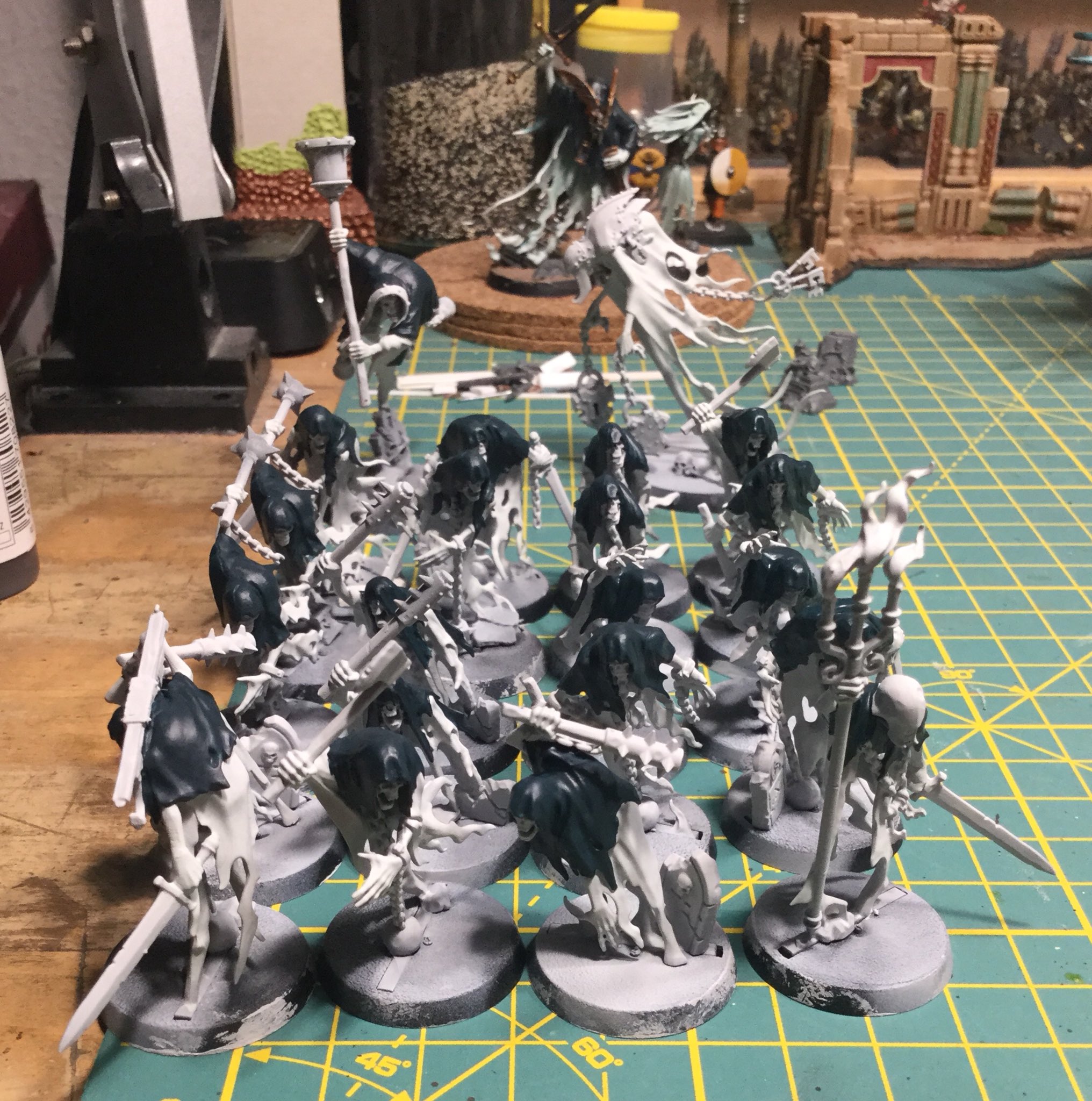 I went with a simple paint scheme in keeping with my Nighthaunts. I was inspired by some of the work I've seen done on the Necrons and I think the sharp (but barely visible in the photograph) highlight of green brings some nice variance in the model. I'd actually be tempted to add another final highlight but we'll have to wait and see on that front as I have to get the Chainrasps done. A solid evenings work will see the full twenty ready for the battlefield.